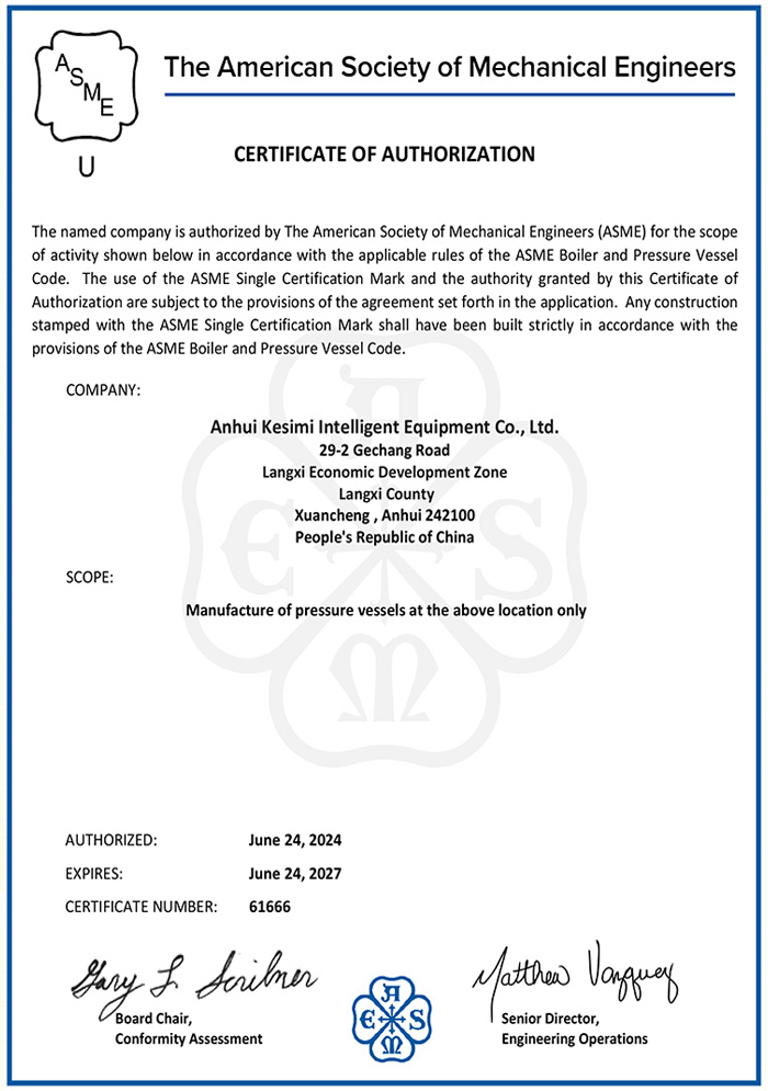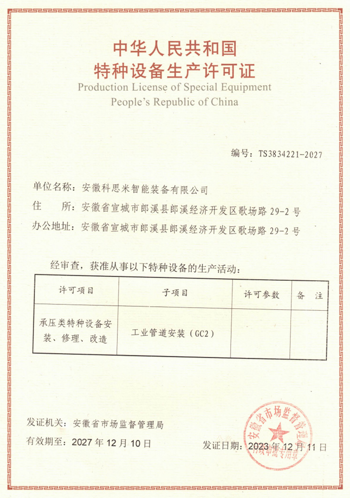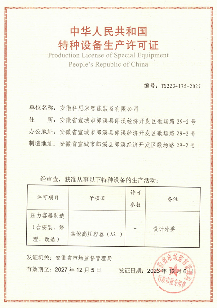 企业地处苏浙皖交界的宣城,占地20000㎡,厂房面积12000多平方,其中洁净厂房1000平方,现有固定资产2000多万元,职工人数50多人,其中专业技术人员20人,企业各职能科室齐全、装备完整、检测手段齐全、质保体系完整。企业具有A2类压力容器制造许可证、ASME U证书、GC2压力管道安装证书、机电安装工程专业承包贰级资质,并拥有多项专利技术。